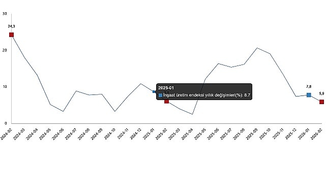 İnşaat üretim endeksi yıllık değişimleri(%), Şubat 2026