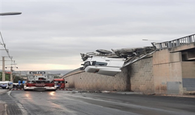 İzmir İtfaiyesi kaza sonrası viyadükte asılı kalan tır şoförünü kurtardı
